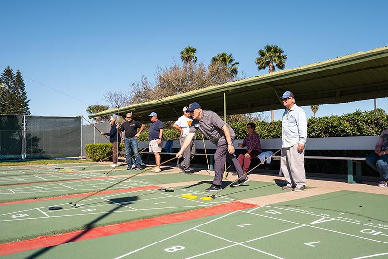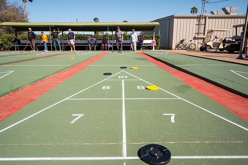 Our ever-popular shuffleboard court (resurfaced in 2023) is a great outdoor activity and a wonderful way to meet new friends! Also has new lighting for night time play!