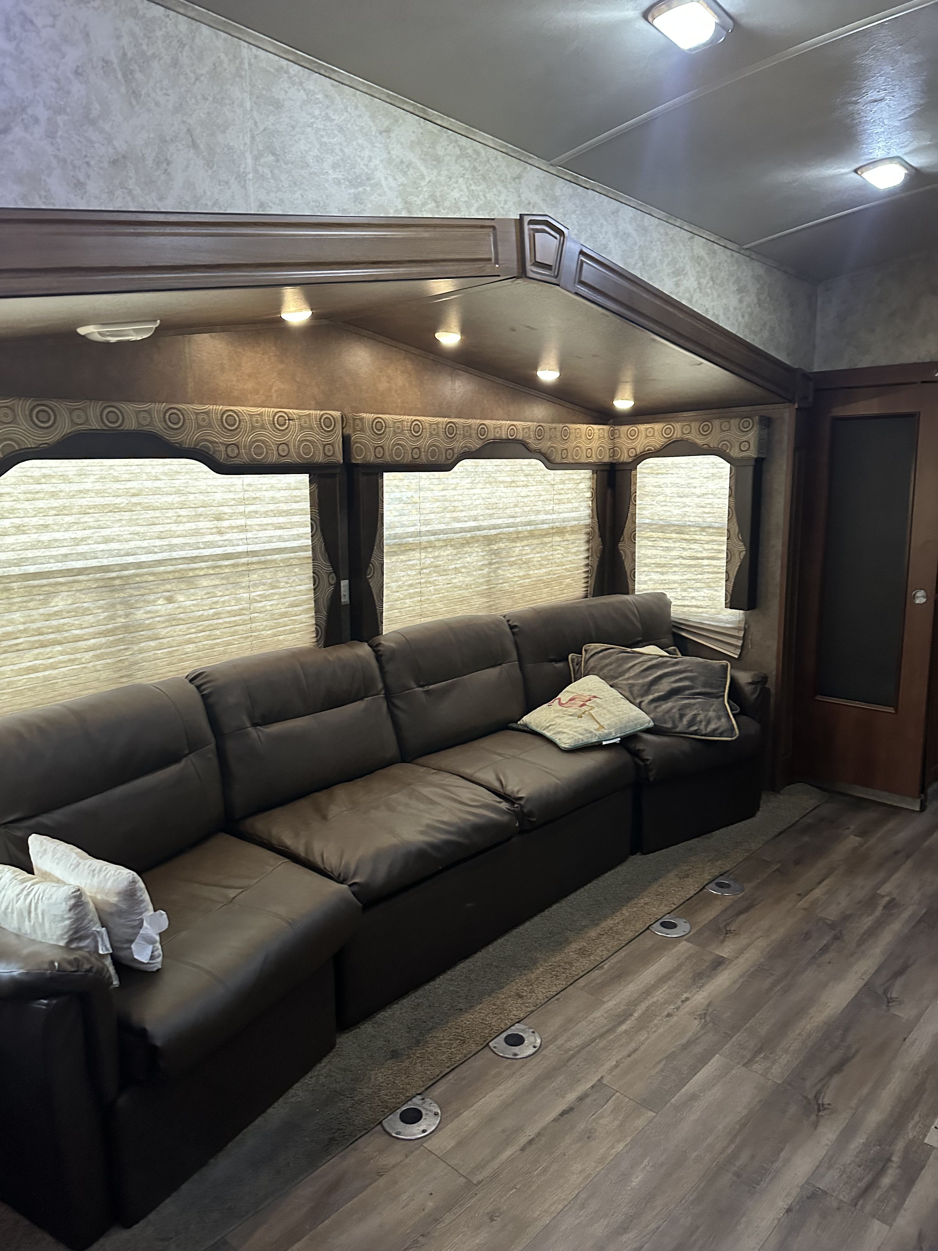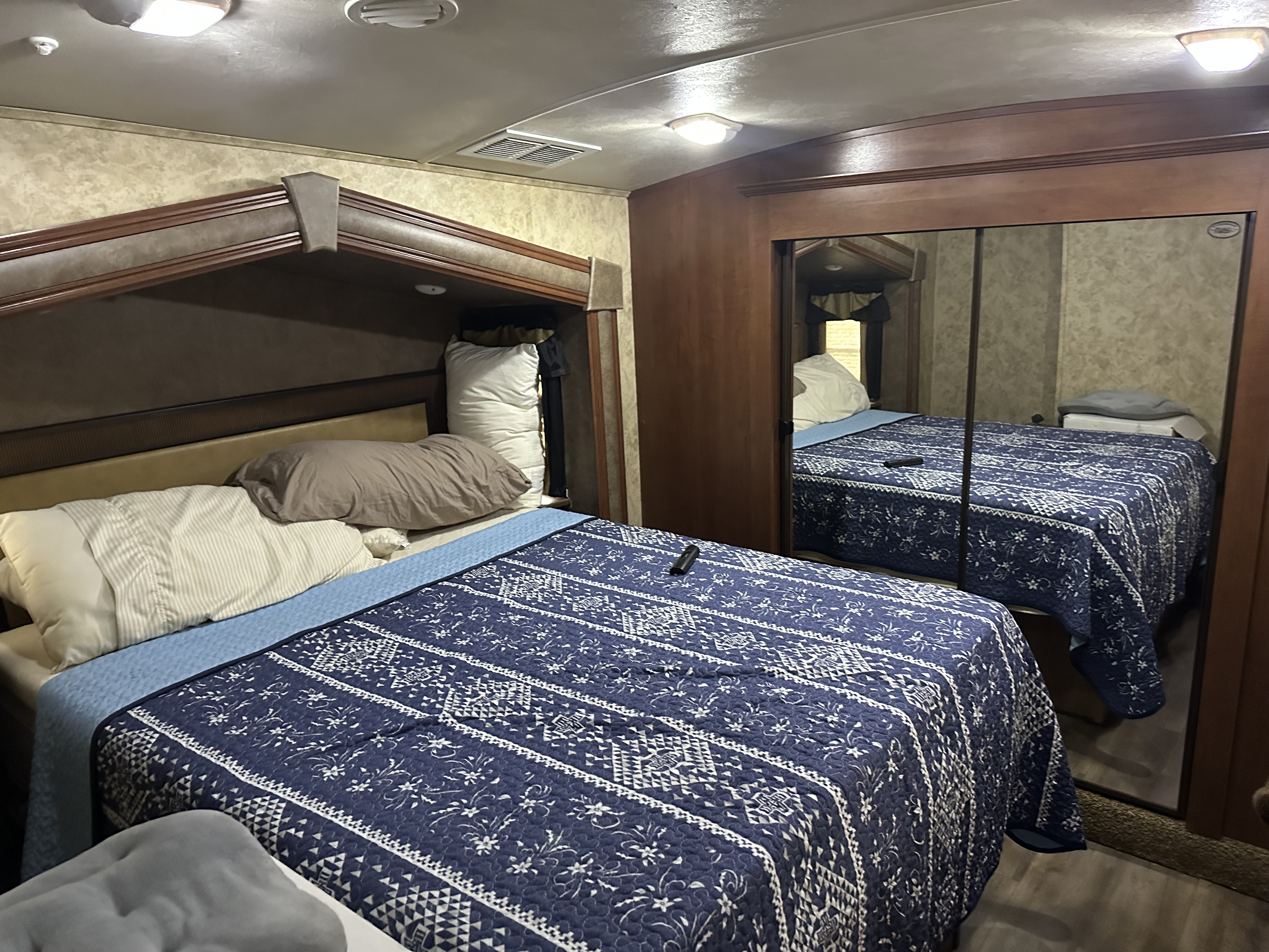 RV lot for sale. 39' Cedar Creek RV. 2 bedroom, 2 bath, furnished with gas range, microwave, dishwasher, fridge, freezer, and gas furnace. It has a covered patio. Outdoor kitchen with a small refrigerator and microwave and a retractable awning. The lot is fully covered with an awning. TVs in each bedroom and living room. The main bathroom has a regular toilet installed.