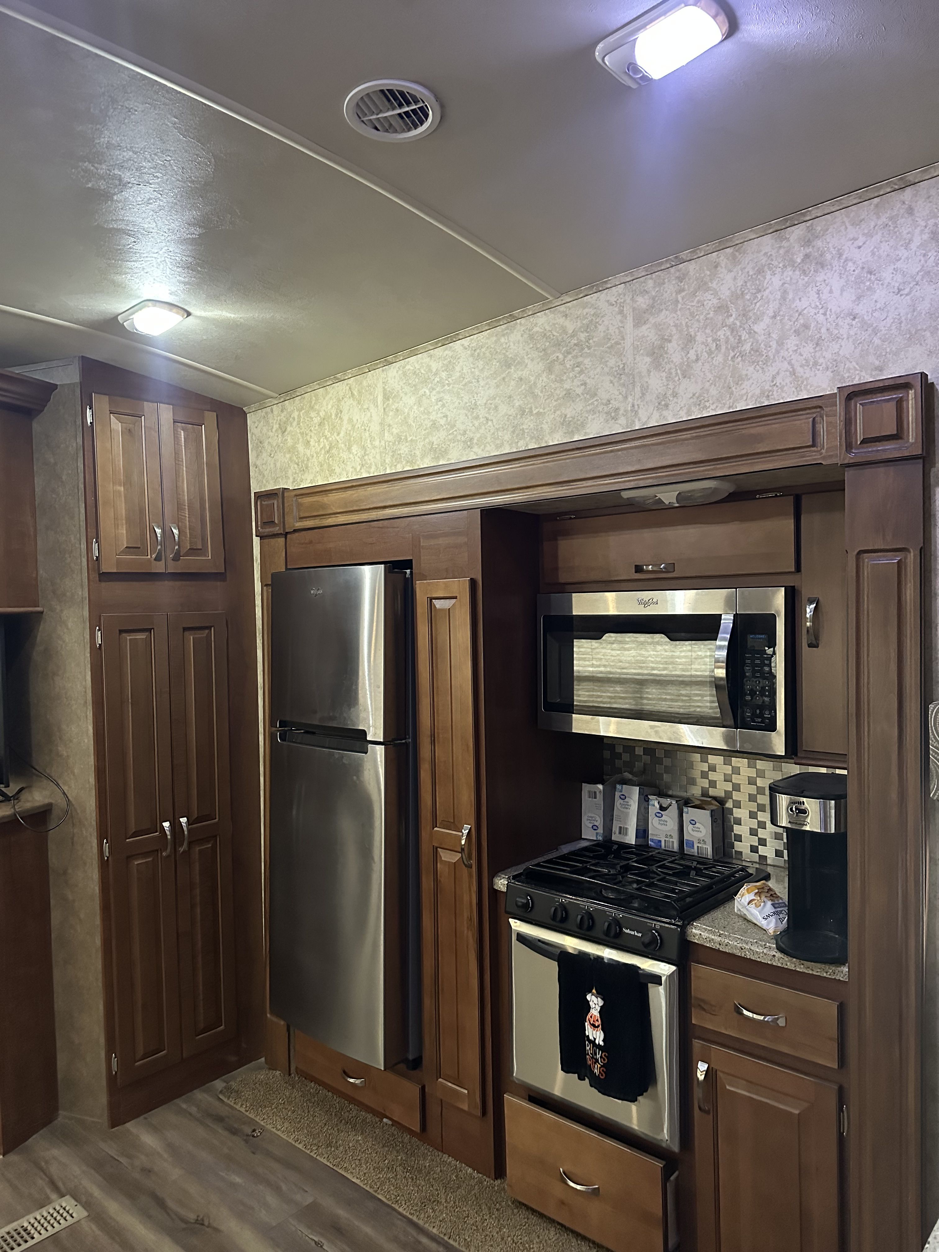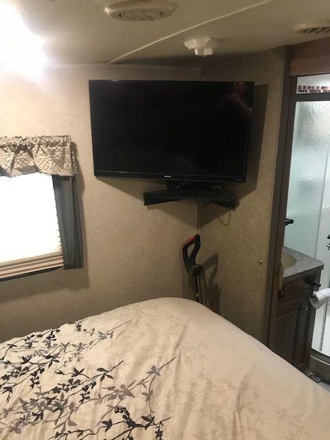 RV lot for sale. 2018 Flagstaff RV furnished with gas range, microwave, fridge, freezer, central air, and gas furnace. 1 bedroom and 1 bath.
