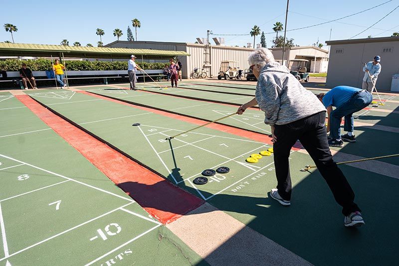 Our ever-popular shuffleboard court (resurfaced in 2023) is a great outdoor activity and a wonderful way to meet new friends! Also has new lighting for night time play!