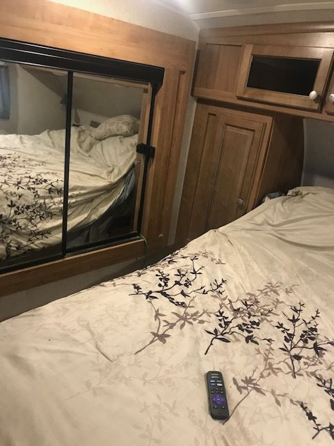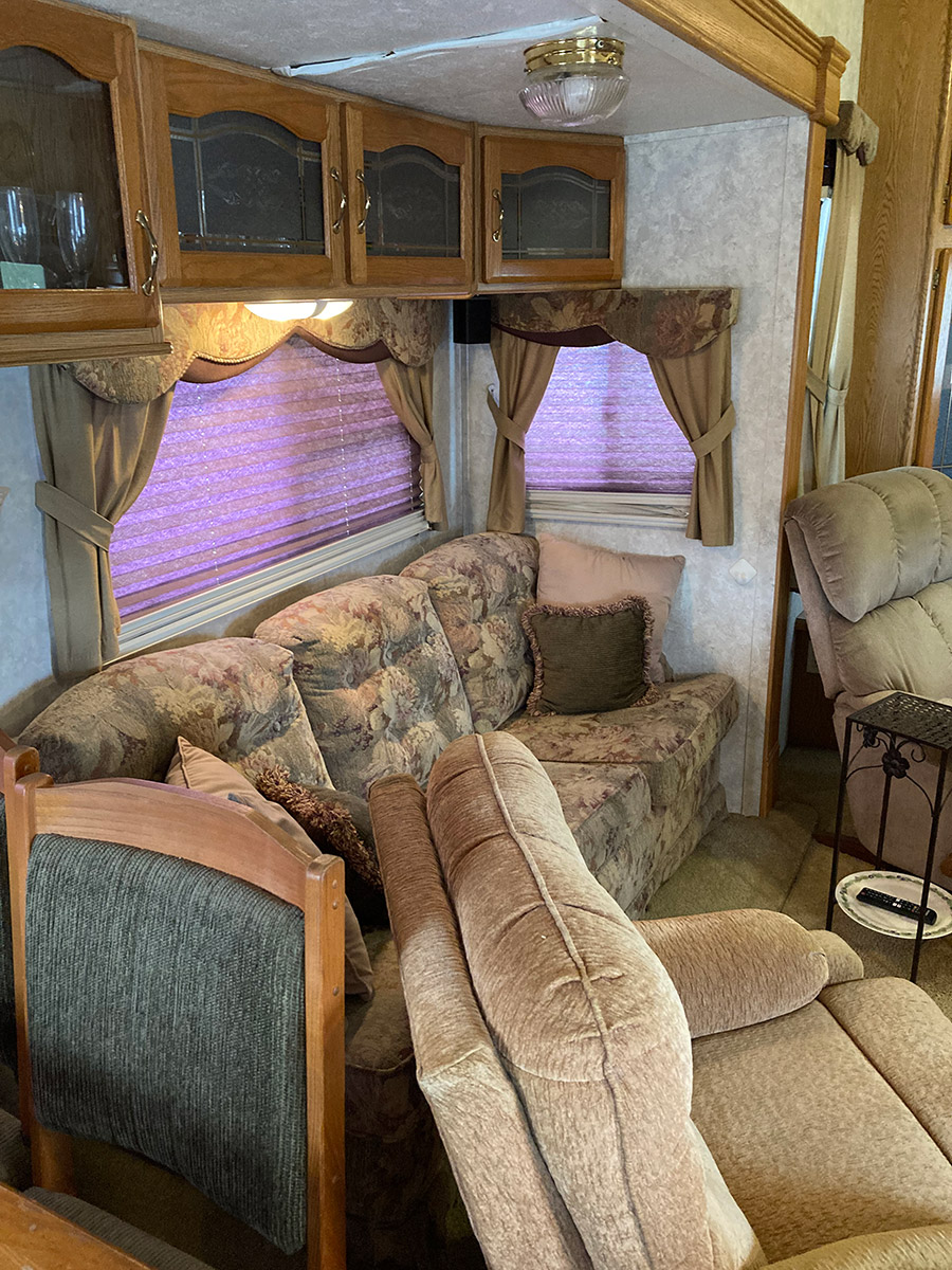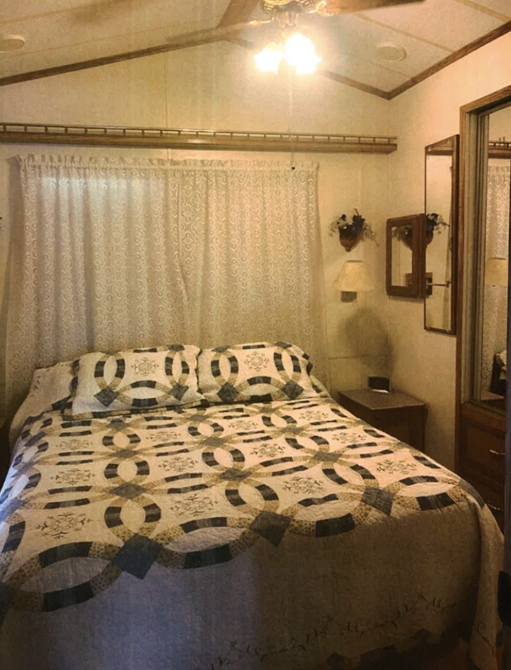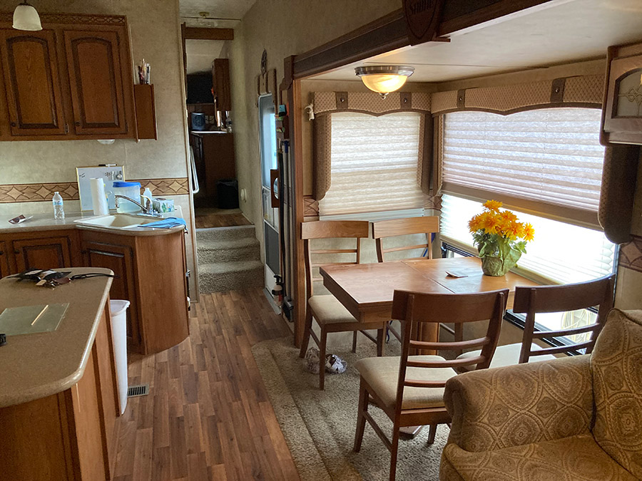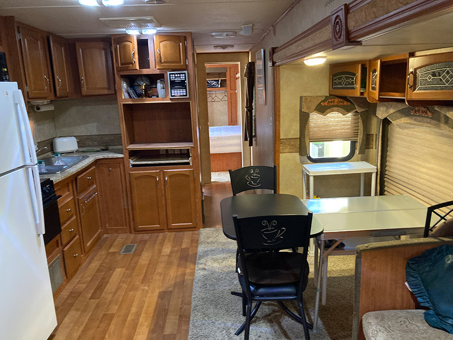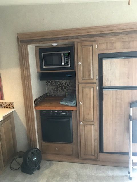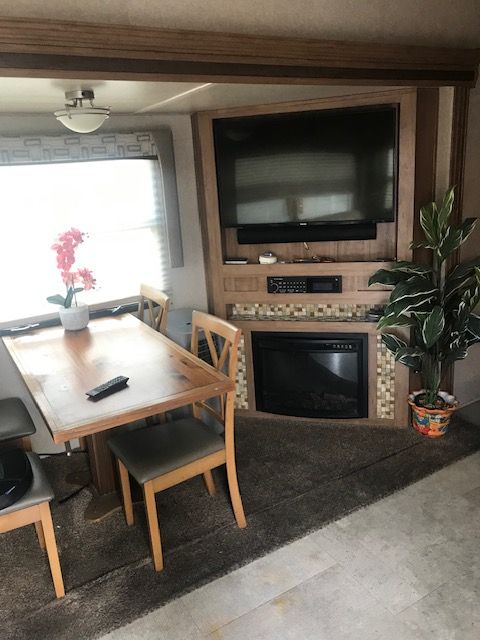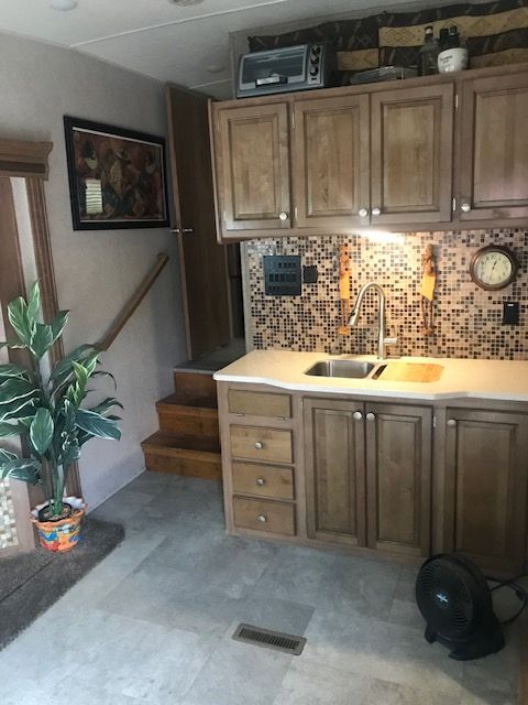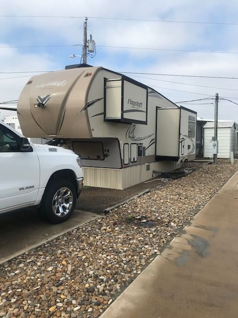 RV lot for sale. 2018 Flagstaff RV furnished with gas range, microwave, fridge, freezer, central air, and gas furnace. 1 bedroom and 1 bath.