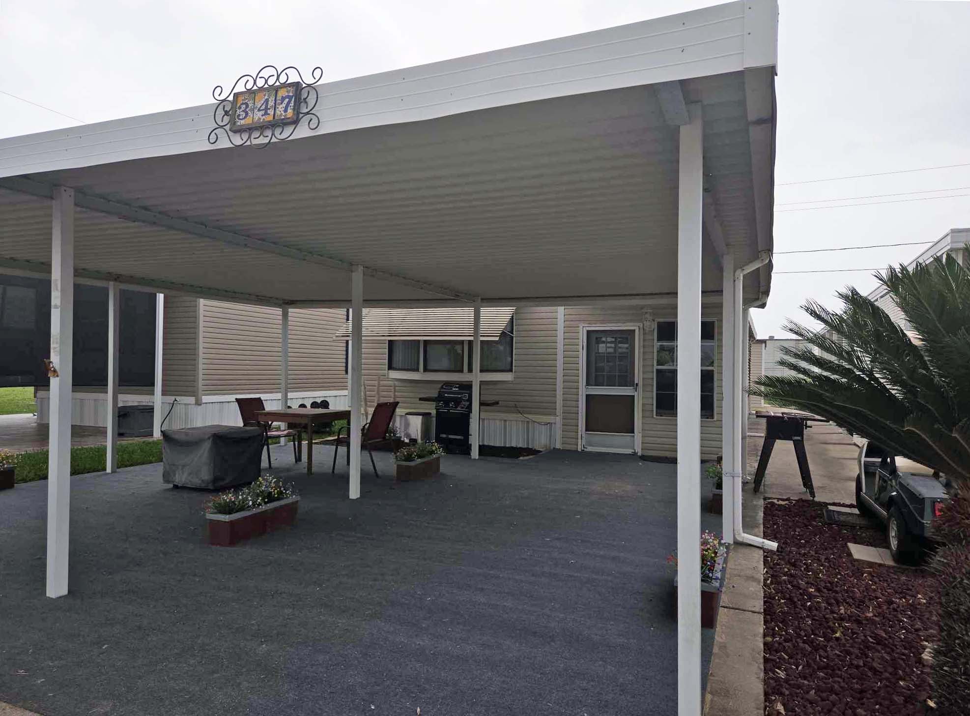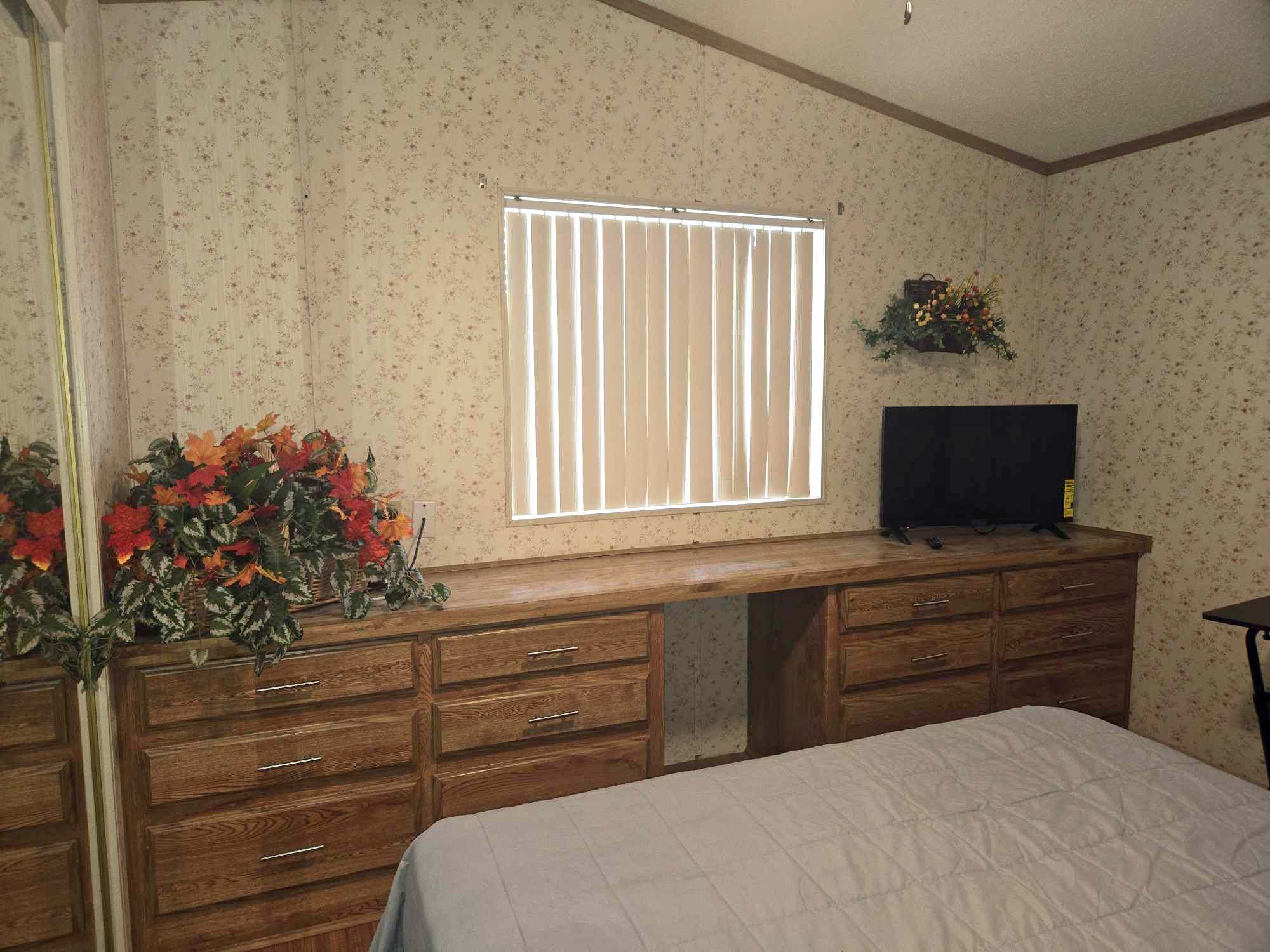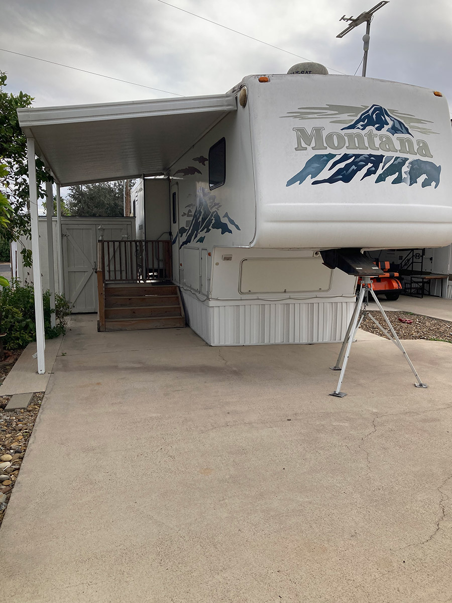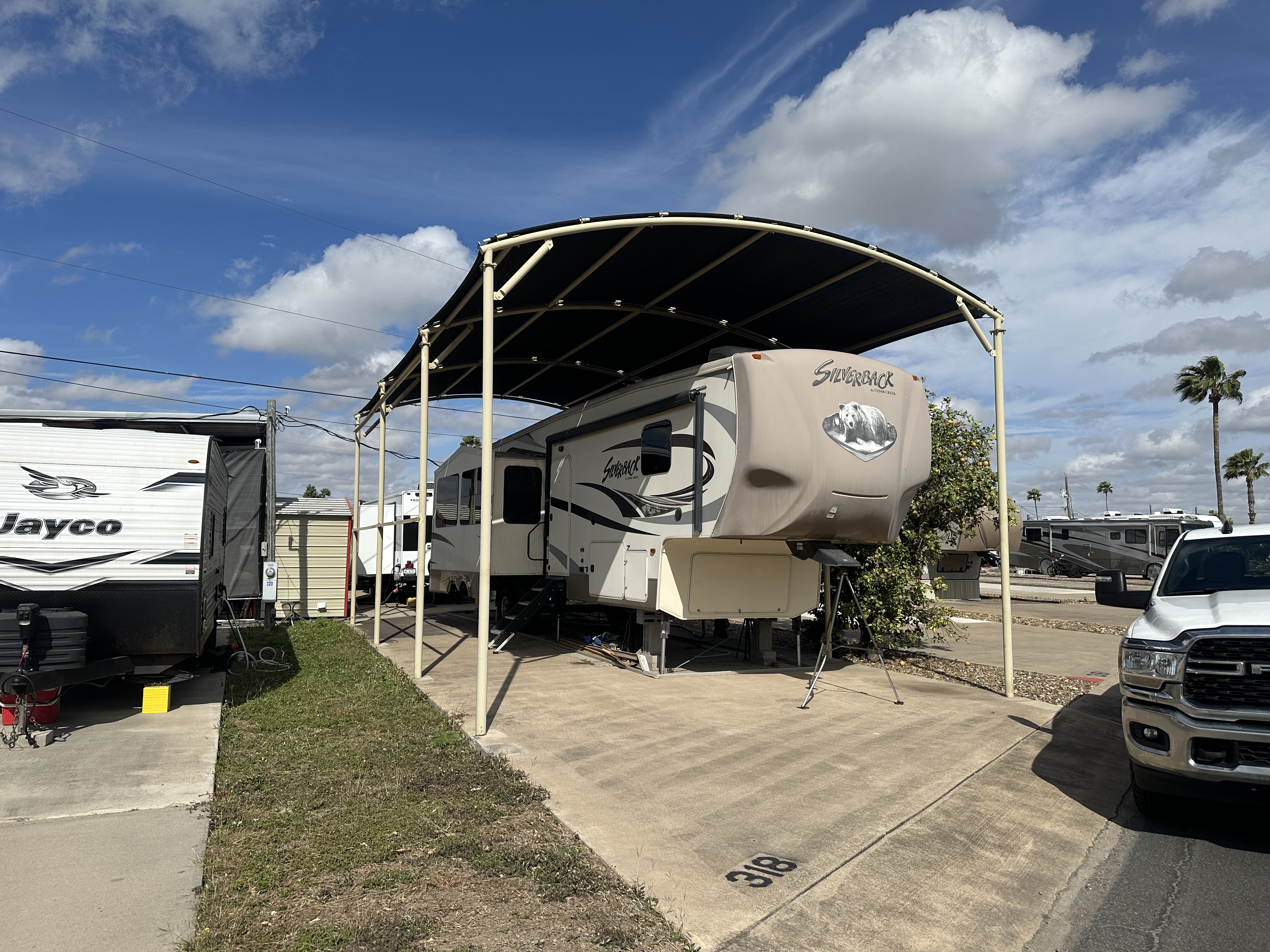 RV lot for sale. 39' Cedar Creek RV. 2 bedroom, 2 bath, furnished with gas range, microwave, dishwasher, fridge, freezer, and gas furnace. It has a covered patio. Outdoor kitchen with a small refrigerator and microwave and a retractable awning. The lot is fully covered with an awning. TVs in each bedroom and living room. The main bathroom has a regular toilet installed.