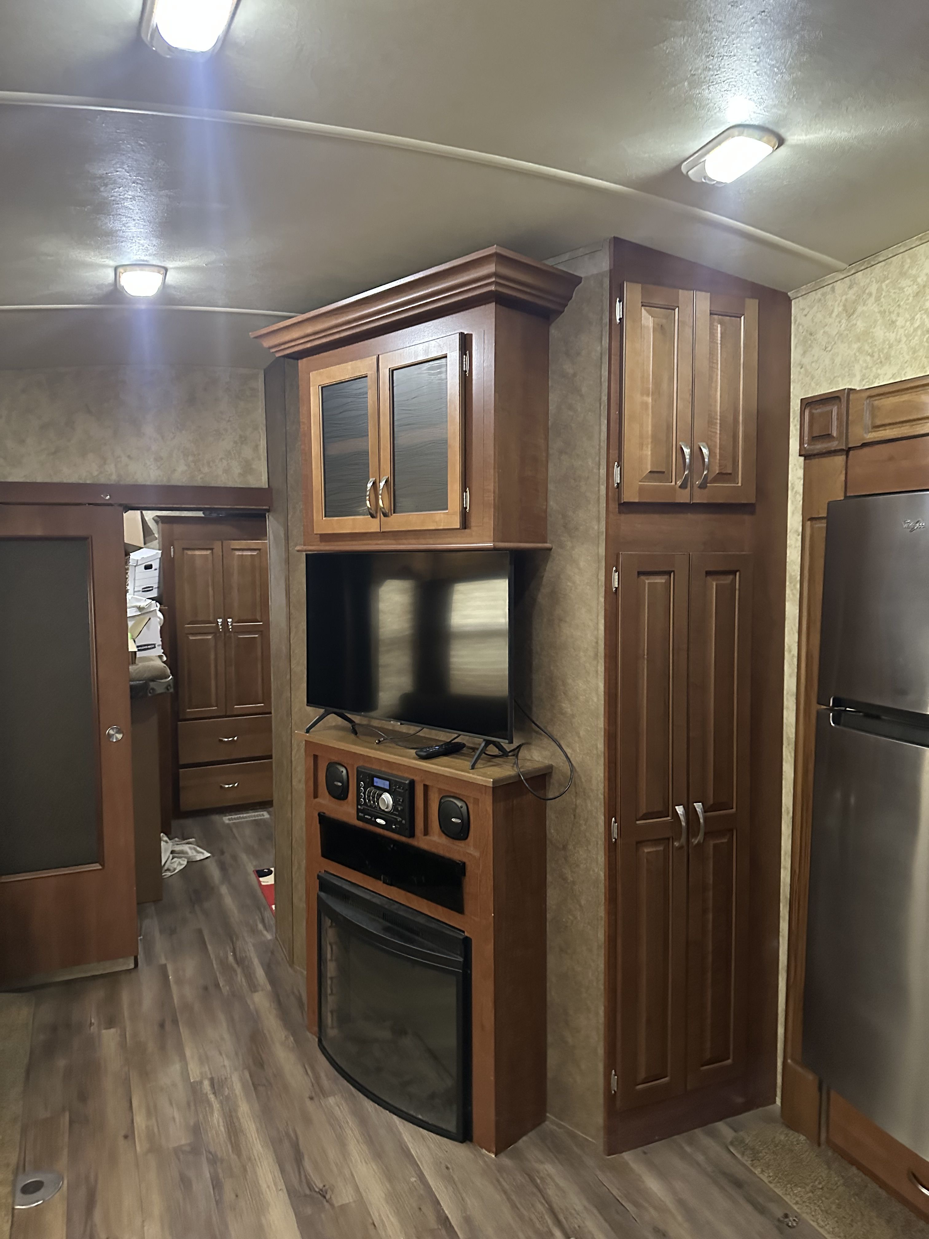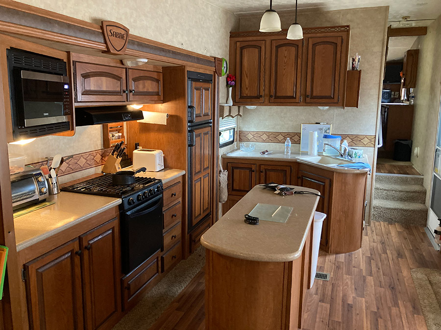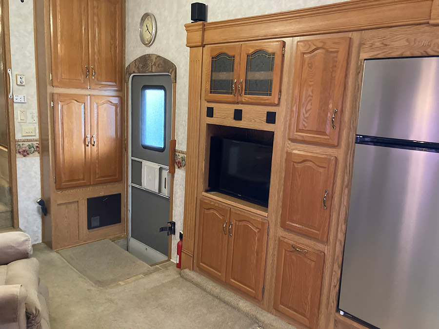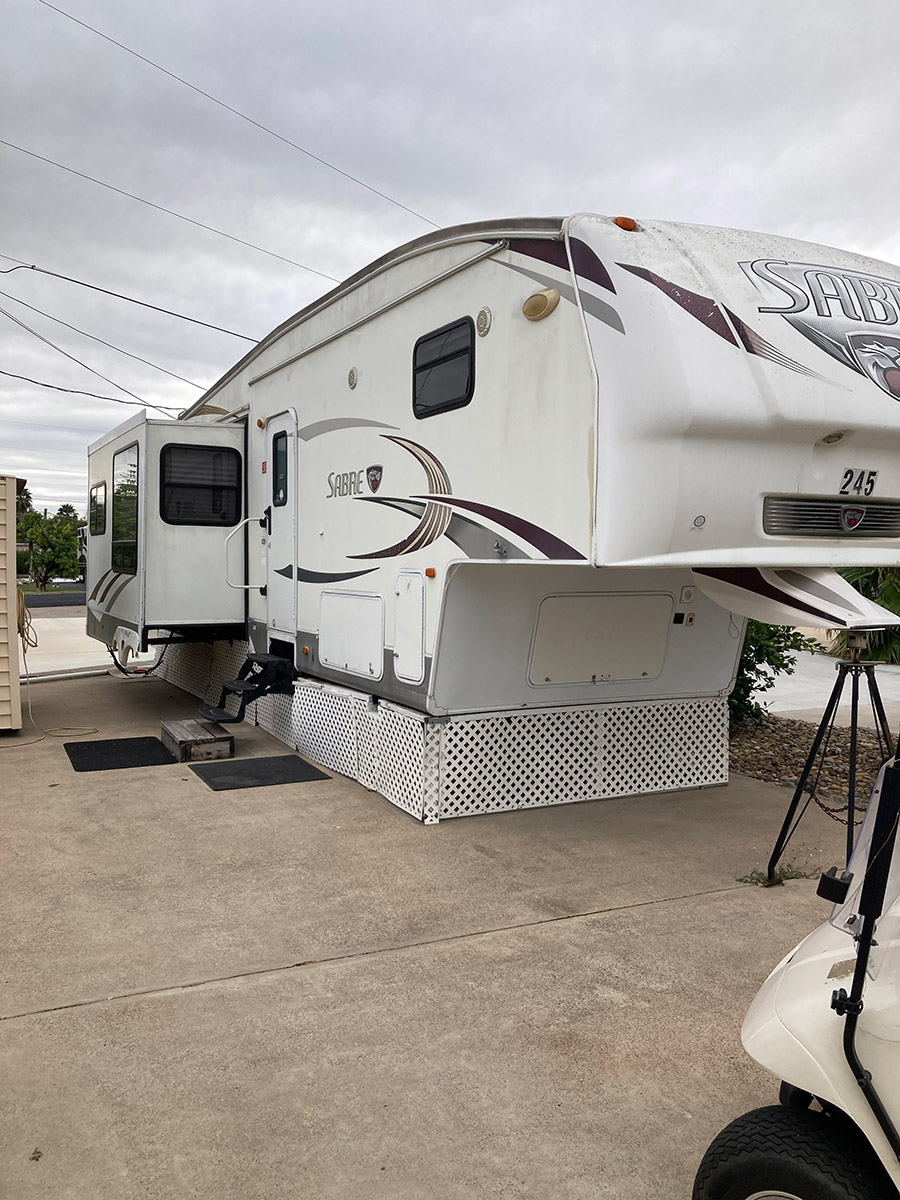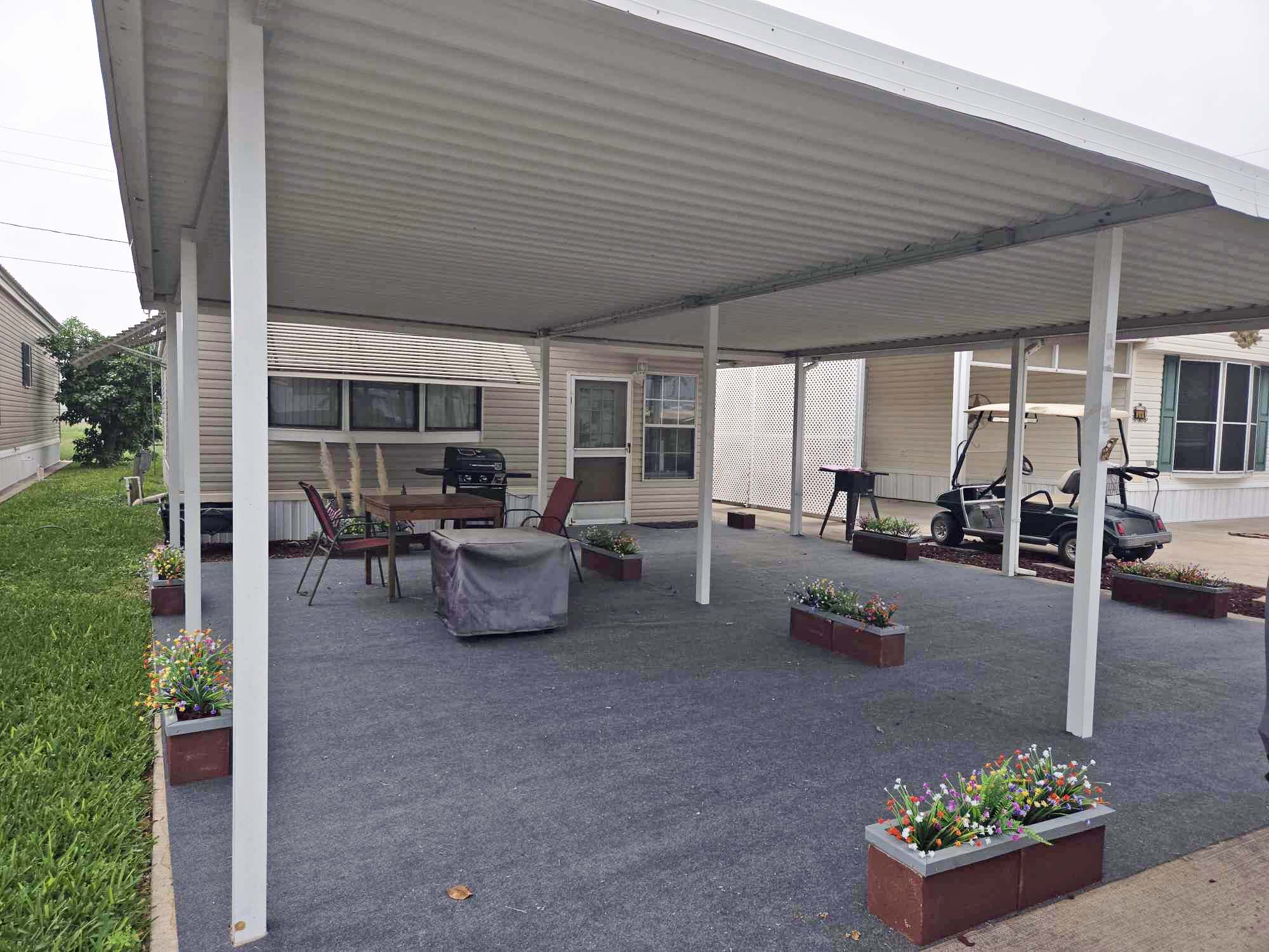 RV lot for sale. 39' Cedar Creek RV. 2 bedroom, 2 bath, furnished with gas range, microwave, dishwasher, fridge, freezer, and gas furnace. It has a covered patio. Outdoor kitchen with a small refrigerator and microwave and a retractable awning. The lot is fully covered with an awning. TVs in each bedroom and living room. The main bathroom has a regular toilet installed.