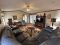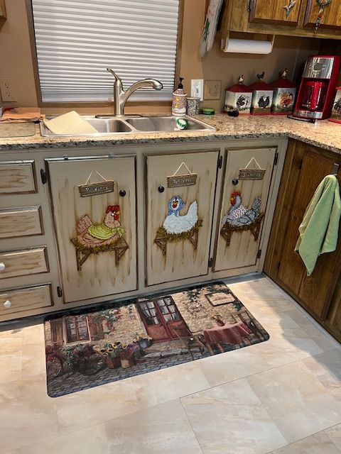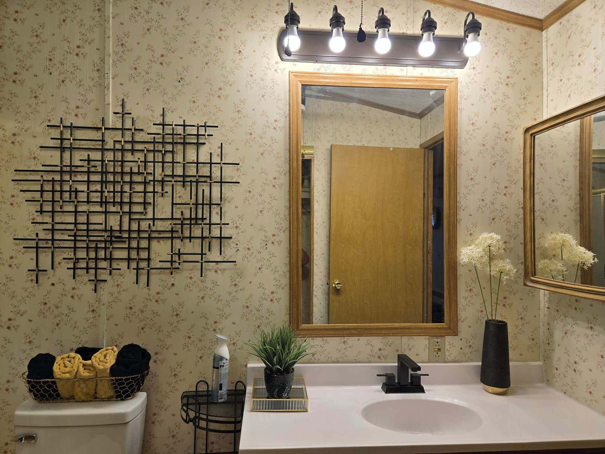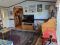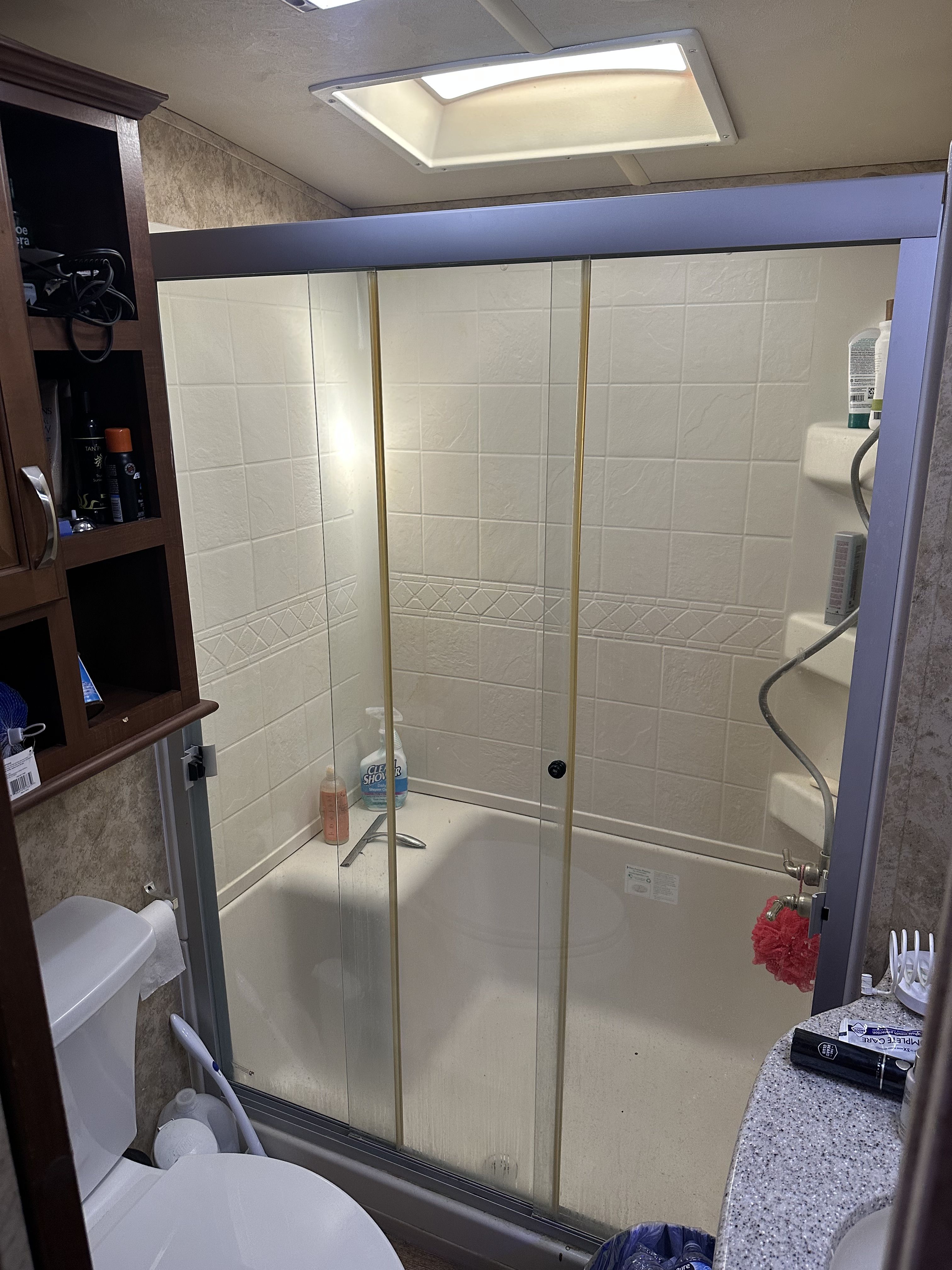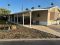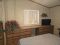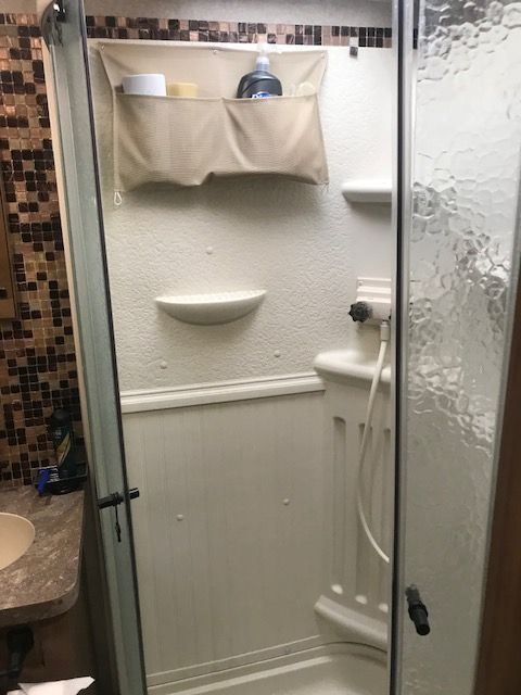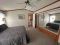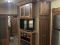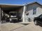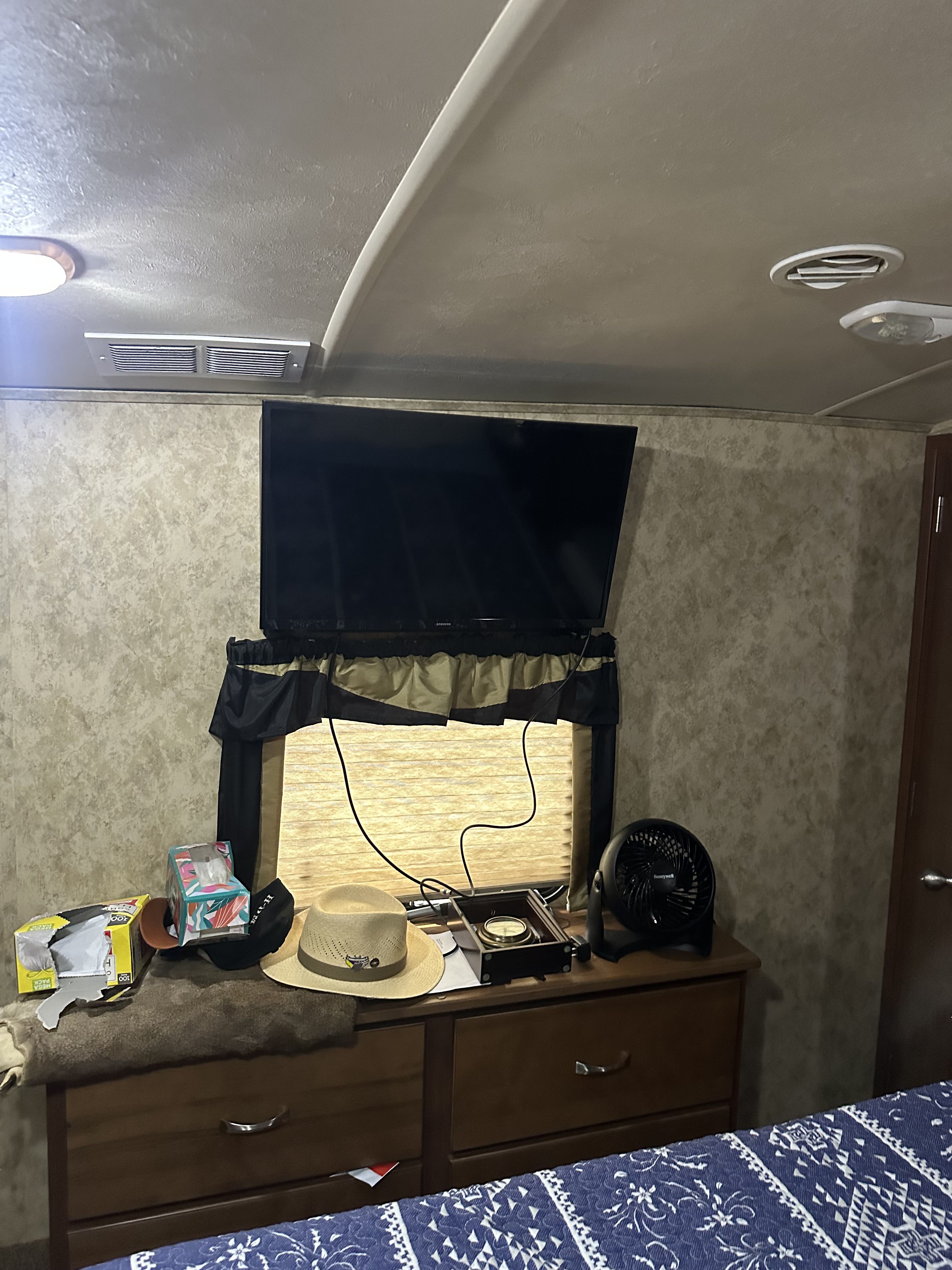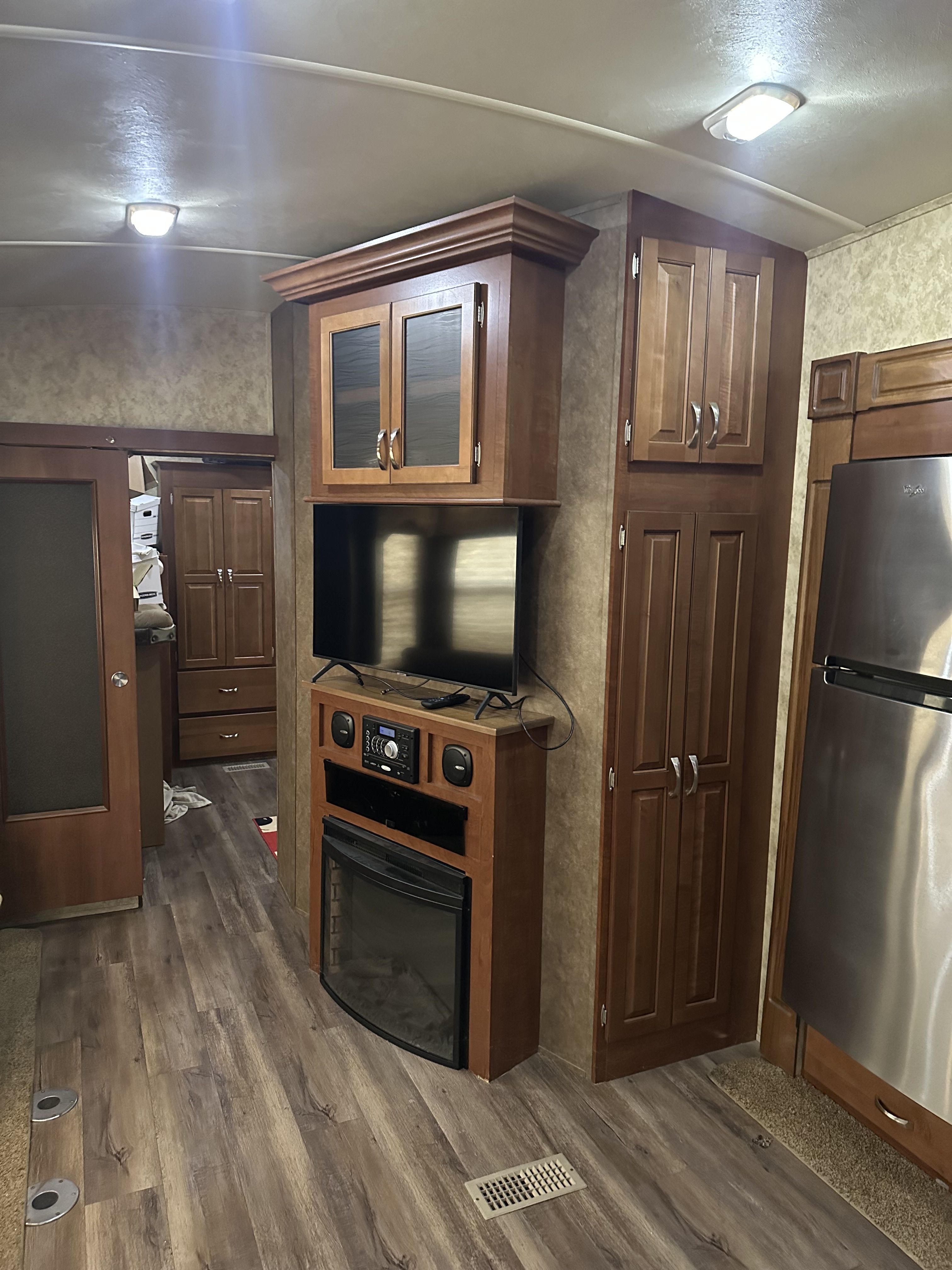 RV lot for sale. 39' Cedar Creek RV. 2 bedroom, 2 bath, furnished with gas range, microwave, dishwasher, fridge, freezer, and gas furnace. It has a covered patio. Outdoor kitchen with a small refrigerator and microwave and a retractable awning. The lot is fully covered with an awning. TVs in each bedroom and living room. The main bathroom has a regular toilet installed.