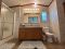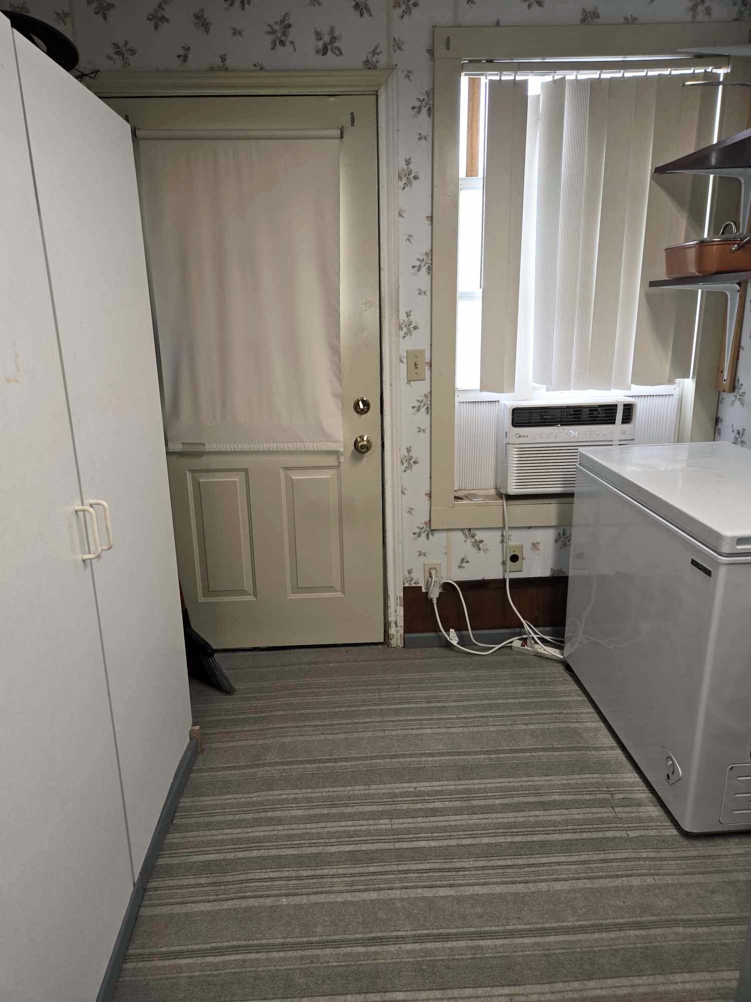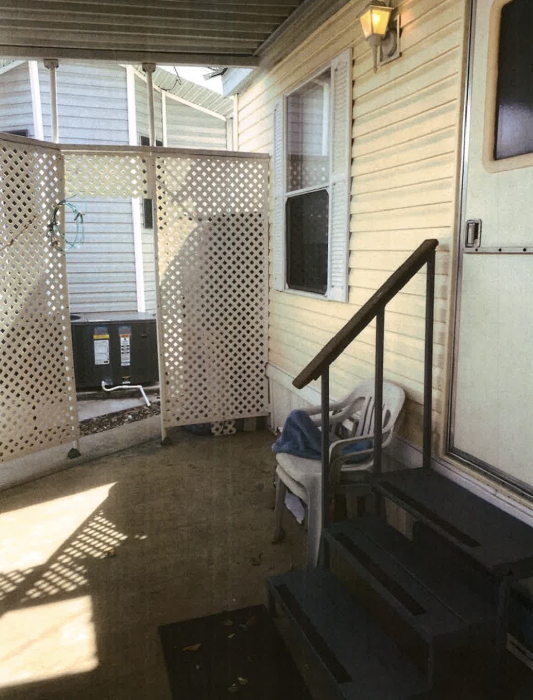 2 bedroom, 1.5 bath with laundry room, gas range, microwave, fridge, central air, gas furnace, and vinyl siding. Small storage/work room attached to porch.